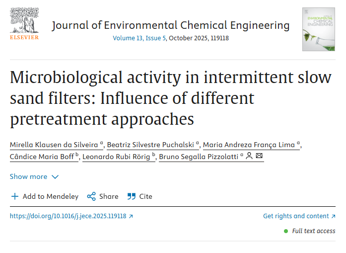 Compartilhamos aqui a nossa nova publicação: Microbiological activity in intermittent slow sand filters: Influence of different pretreatment approaches.